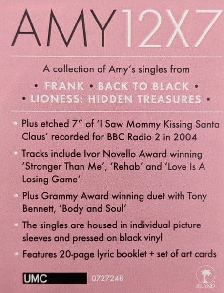 Singles de Amy Winehouse em vinil de 7″ a 45rpm. Retirado dos álbuns Frank, Back to Black e Lioness. Tesouros escondidos. A caixa também inclui o single vencedor do Grammy “Body and Soul”. Embalados com sleeves personalizados. Embalagem elegante com livreto de 20 páginas (letra de música e cartões de arte).