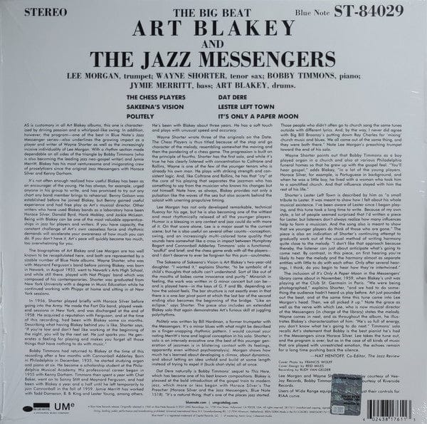Clássico do hard bop, de 1960, o álbum The Big Beat tem uma das maiores formações do Jazz Messengers, com o lendário baterista Art Blakey acompanhado por Lee Morgan (trompete), Wayne Shorter (sax tenor), Bobby Timmons (piano)e Jymie Merritt (baixo). O álbum apresenta três composições de Shorter, e o destaque é a conhecida versão do tema “Dat Dere”, de Timmons.