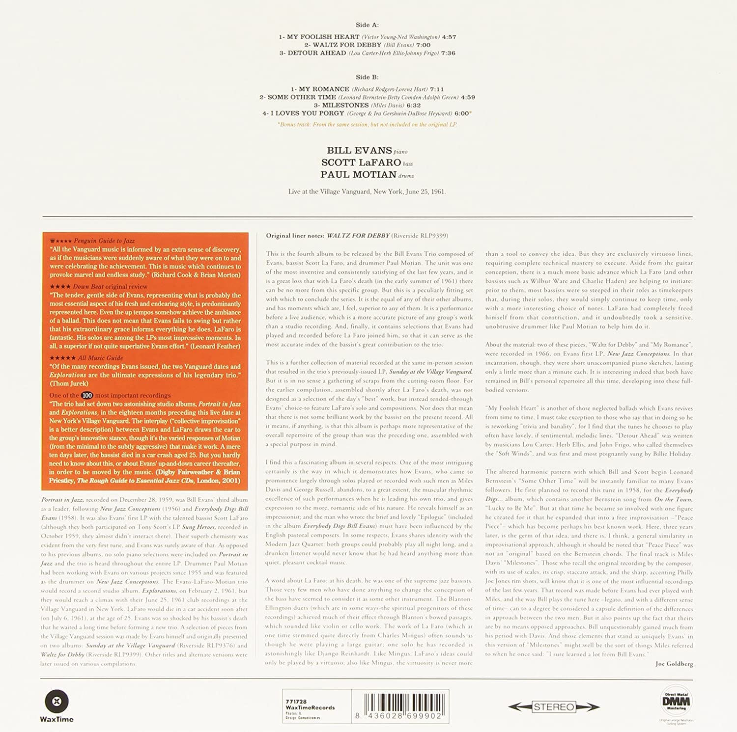 Bill Evans participou do clássico “Kind of Blue”de Miles Davis e logo após, Evans, viria a formar um dos trios mais inovadores e memoráveis de sua carreira, com o baixista Scott LaFaro e o baterista Paul Motian. Em 1961, eles fizeram um show ao vivo no Village Vanguard que incluiu a música “Waltz for Debby”, uma composição que Evans escreveu em 1956 como uma homenagem à sua sobrinha. O set foi gravado e transformado em dois álbuns separados – Waltz for Debby (lançado em 1962) e Sunday at the Village Vanguard – ambos se tornaram joias na discografia do pianista. “Waltz for Debby”, em particular, revela a forte linhagem clássica de Evans, mas também seu vasto vocabulário harmônico e delicada sensação de swing.
