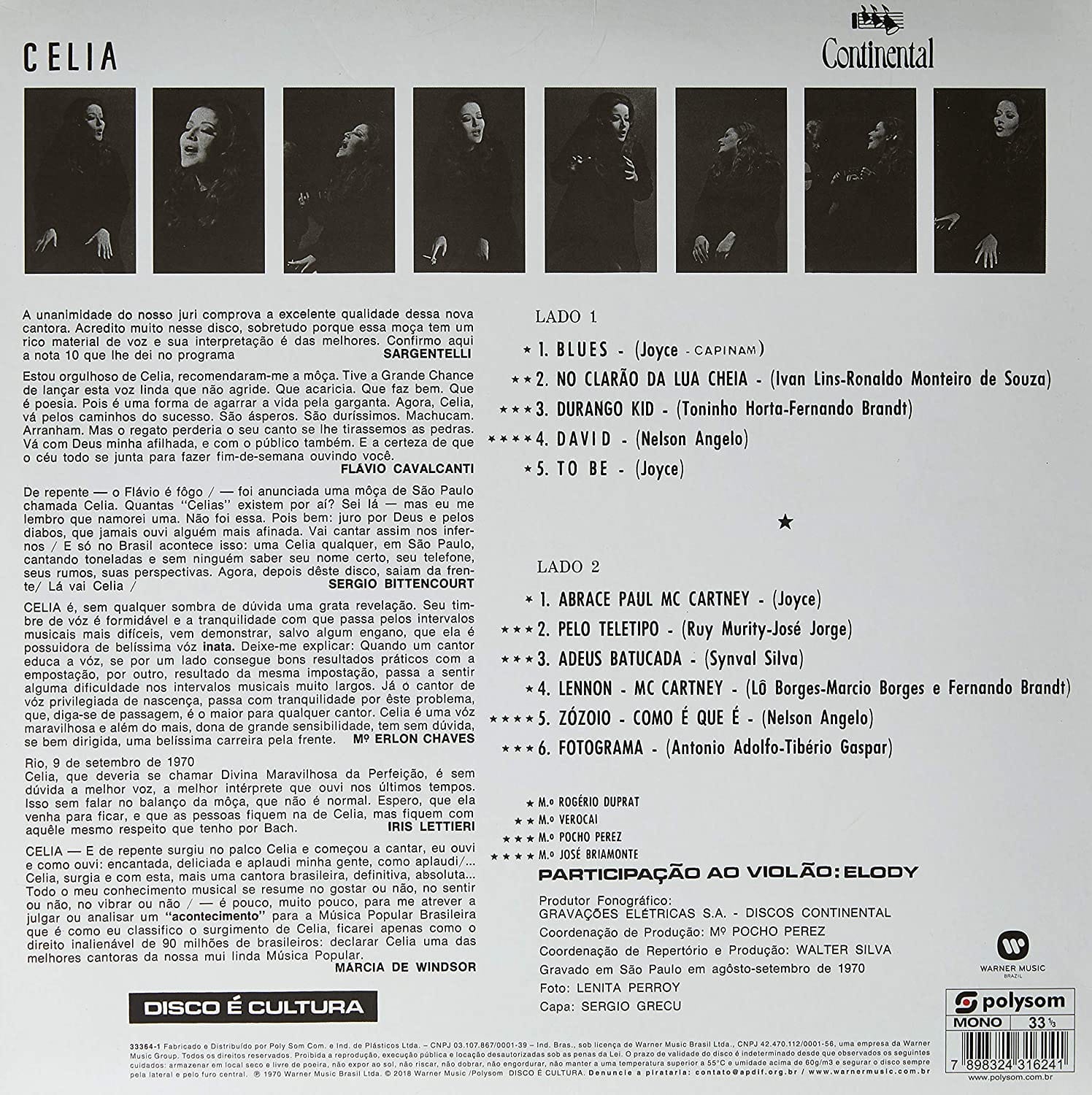Grande intérprete da música brasileira, Célia ganhou destaque no início da década de 70 com a expressividade da sua voz de tom grave. Falecida em 2017, a cantora deixou sua marca registrada na discografia nacional. Após ser apresentada, em 1970, no programa de TV “Um Instante, Maestro”, de Flávio Cavalcanti, ela lançou seu primeiro álbum, homônimo, em 1971. O disco volta às prateleiras, em vinil de 180 de gramas, pela coleção “Clássicos em Vinil”, da Polysom, em parceria com a Warner Music