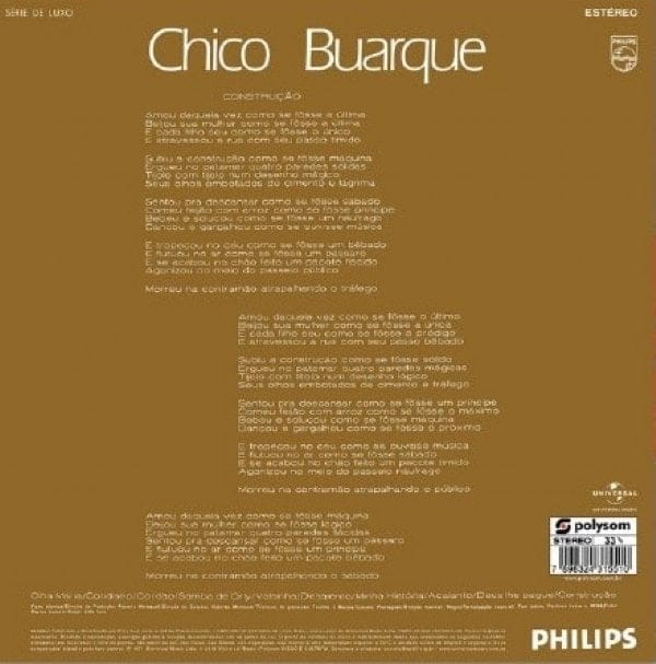 Lançado em 1971 “Construção” é um trabalho do cantor e compositor brasileiro Chico Buarque. Composto em períodos entre o exílio de Chico na Itália e seu retorno ao Brasil.