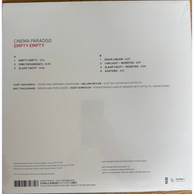 Empty Empty é o terceiro álbum do trio Cinema Paradiso, formado por Kurt Van Herck, Eric Thielemans e Willem Heylen. Diferente dos trabalhos anteriores, este disco conta com a participação integral de Jozef Dumoulin, que já havia contribuído como convidado nos álbuns Volume I e Volume II. Com um repertório que combina composições originais, cantos indianos e uma peça de Claude Debussy, Empty Empty apresenta uma nova paisagem sonora, explorando a fusão entre elementos acústicos e eletrônicos. A intenção do grupo foi criar um som forte e direto, sem perder a riqueza dos timbres e a profundidade acústica. A gravação e mixagem ficaram a cargo de Joris Caluwaerts, no Finster Studio, em Antuérpia, garantindo uma produção cuidadosa que ressalta a identidade singular da banda.