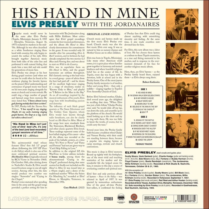 Gravado em outubro de 1960 no RCA Studio B em Nashville, His Hand in Mine inclui faixas como “His Hand in Mine,” “In My Father’s House,” e “Swing Down Sweet Chariot.” O álbum reflete as raízes religiosas de Elvis e sua paixão pelo gospel, gênero que ele frequentemente cantava em momentos de relaxamento e inspiração espiritual.