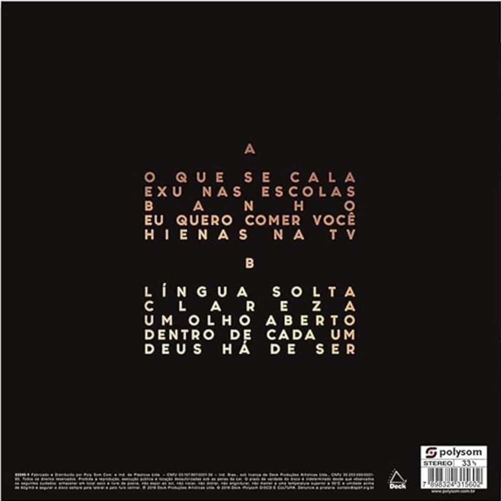 O primeiro single foi “Banho”, uma das 11 faixas inéditas, assinadas por grandes compositores como tulipa Ruiz, Pedro Luís, Alice Coutinho e Rodrigo Campos. Além da Grande Elza, no álbum temos algumas participações especiais como o rapper Edgar e do grupo Ilú Obá de Min.