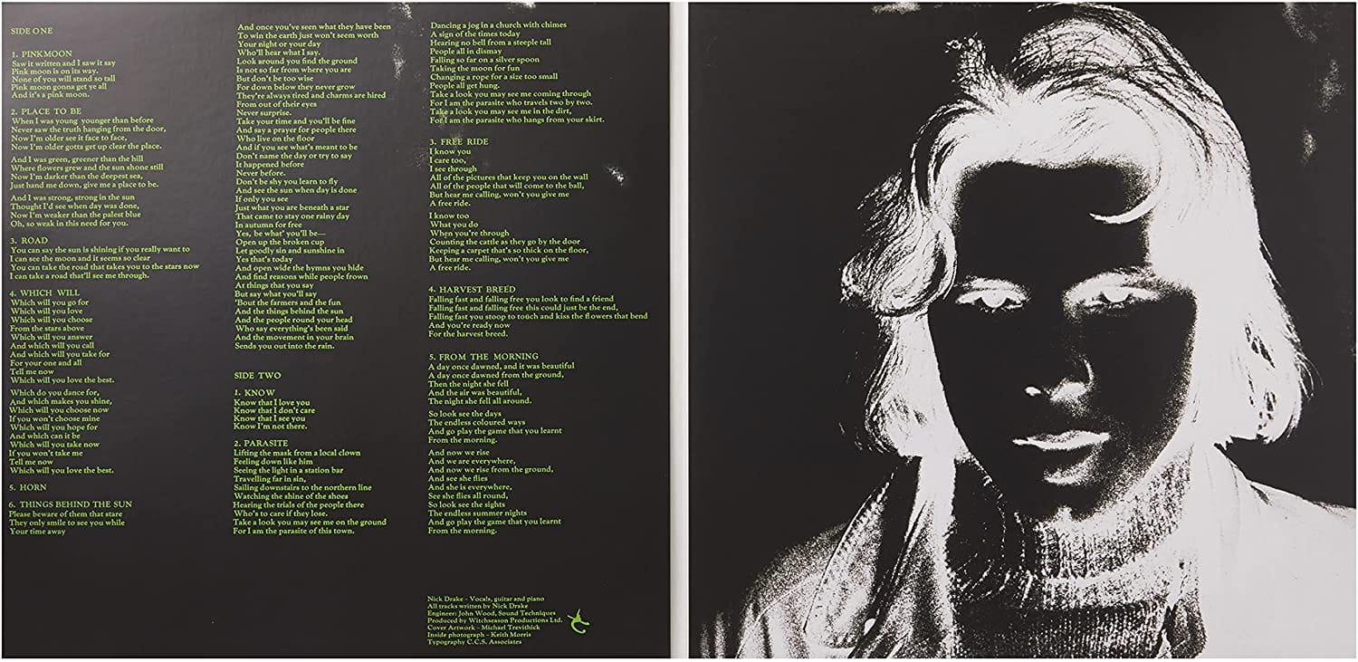 Foi uma mudança radical de seu trabalho anterior, despojado dos exuberantes arranjos orquestrais, Pink Moon apresentou Drake sozinho nos vocais, violão e acompanhamento ocasional de piano.